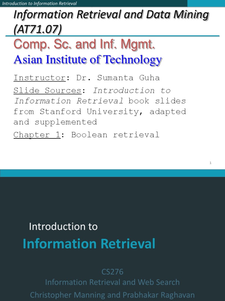 Instructor: Dr. Sumanta Guha Slide Sources: Introduction to Information Retrieval book slides from Stanford University, adapted and supplemented Chapter 1: Boolean retrieval