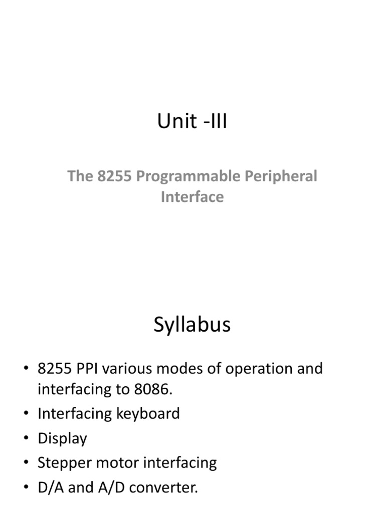 8255 PPI various modes of operation and interfacing to 8086. Interfacing keyboard Display Stepper motor interfacing D/A and A/D converter.