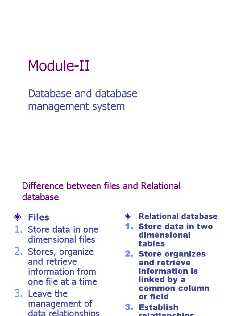 Difference between files and Relational database Files 1. Store data in one dimensional files 2. Stores, organize and retrieve information from one file at a time 3. Leave the management of data relationships to the applications that access the data.