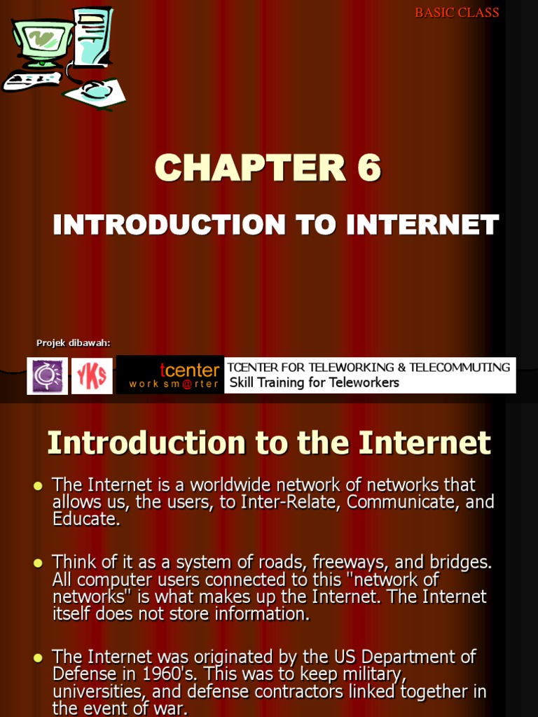 The Internet is a worldwide network of networks that allows us, the users, to Inter-Relate, Communicate, and Educate. Think of it as a system of roads, freeways, and bridges. All computer users connected to this "network of networks" is what makes up the Internet. The Internet itself does not store information. The Internet was originated by the US Department of Defense in 1960's. This was to keep military, universities, and defense contractors linked together in the event of war. In the early days, what we call the Internet was then known as ARPANet (Advanced Research Projects Agency Network).