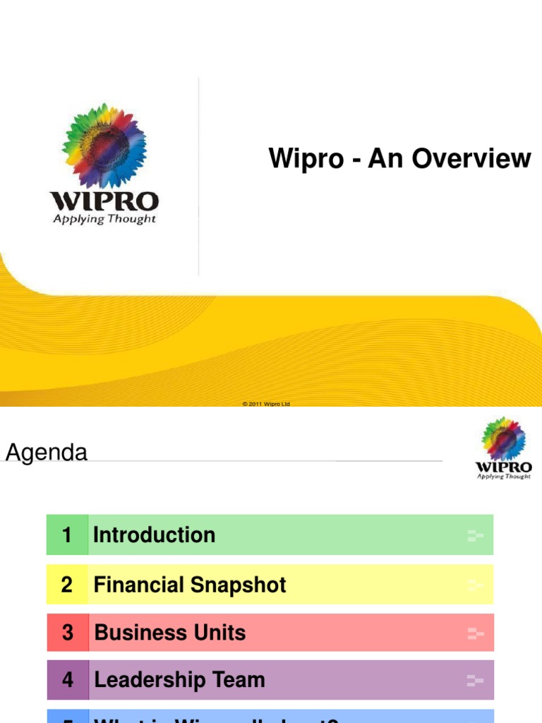 1 Introduction 2 Financial Snapshot 3 Business Units 4 Leadership Team 5 What is Wipro all about?