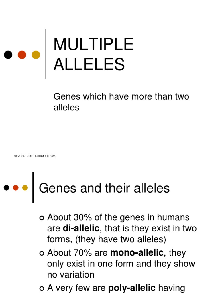 About 30% of the genes in humans are di-allelic, that is they exist in two forms, (they have two alleles) About 70% are mono-allelic, they only exist in one form and they show no variation A very few are poly-allelic having more than two forms