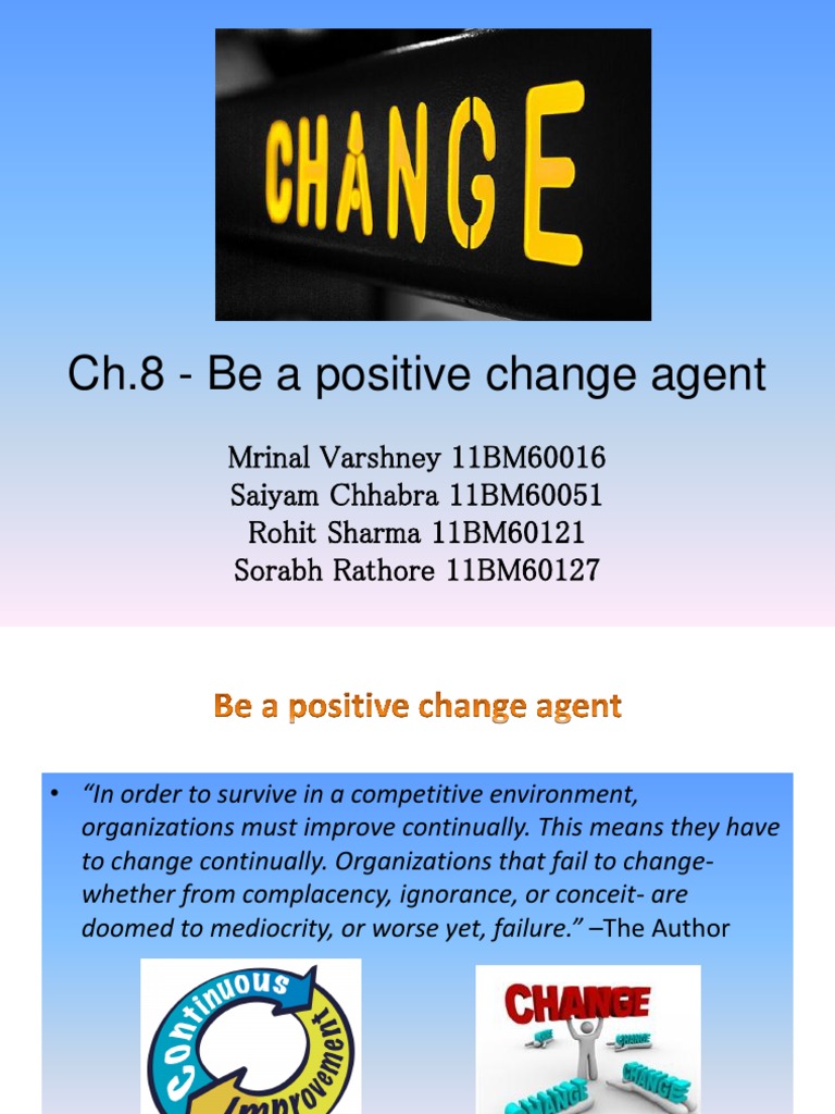 Incorporate the positive change process Once the organization has gone through the change, both the change itself and the process of change should be incorporated into organization's culture. If this does not occur organization will begin to backslide and retrench. Some strategies to anchor a change in culture. 1. Showcase the results- Projected benefits should be showcased as soon as it is realized. The sooner , the better. 2. Communicate constantly- Do not assume that stakeholders will automatically see, understand and appreciate the results gained by change. We need to talk about results and corresponding benefits constantly. 3. Remove resistant employees- If key personnel are still fighting the change that has been made and producing the desired results, give them get with it or get out option. This may seem harsh but employees in all organization are paid to move organization forward and not to hold it back.
