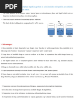 Patients who have problems in swallowing solid dosage forms require drugs to be dispersed in a liquid. Oral suspensions permit the formulation of poorly soluble drugs in the form of liquid dosage form. Drugs, which possess unpleasant taste in solution dosage form like paracetamol, chloramphenicol palmitate etc. can be formulated as palatable suspension as they are suitable for administration to peadiatric patients. The rate of absorption of a drug from suspension is usually faster than solid dosage form but slower than solution. If drug is unstable when in contact with vehicle, suspension should be prepared immediately prior to handing out to the patient in order to reduce the amount of time that the drug particles are in contact with dispersion medium. e.g Ampicillin suspension