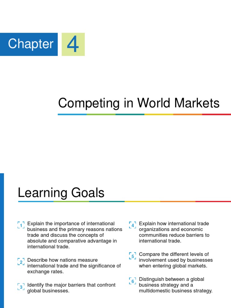 Explain the importance of international business and the primary reasons nations trade and discuss the concepts of absolute and comparative advantage in international trade. Describe how nations measure international trade and the significance of exchange rates. Identify the major barriers that confront global businesses.