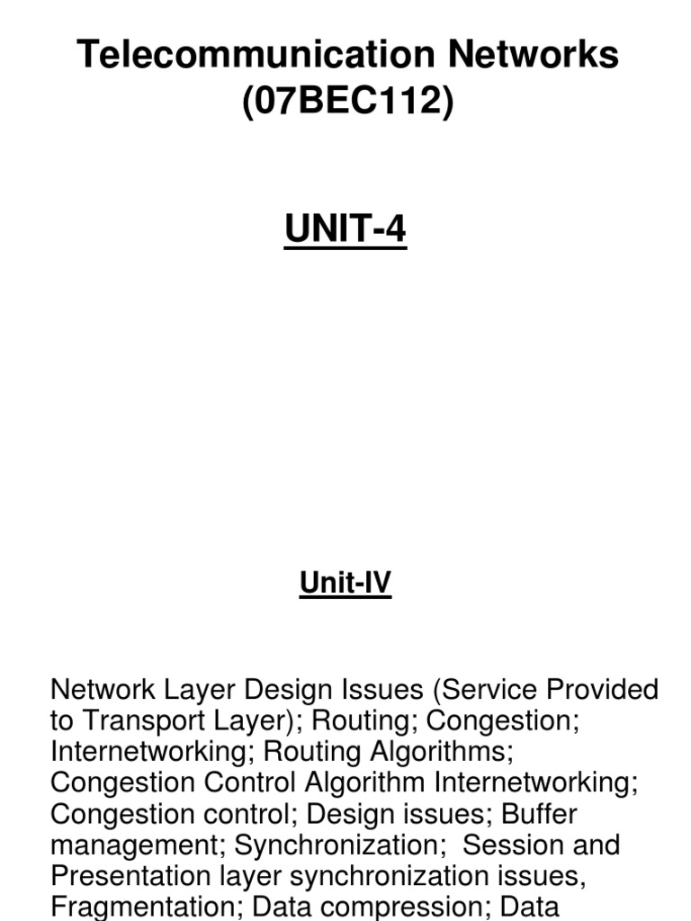 Network Layer Design Issues (Service Provided to Transport Layer); Routing; Congestion; Internetworking; Routing Algorithms; Congestion Control Algorithm Internetworking; Congestion control; Design issues; Buffer management; Synchronization; Session and Presentation layer synchronization issues, Fragmentation; Data compression; Data Security.
