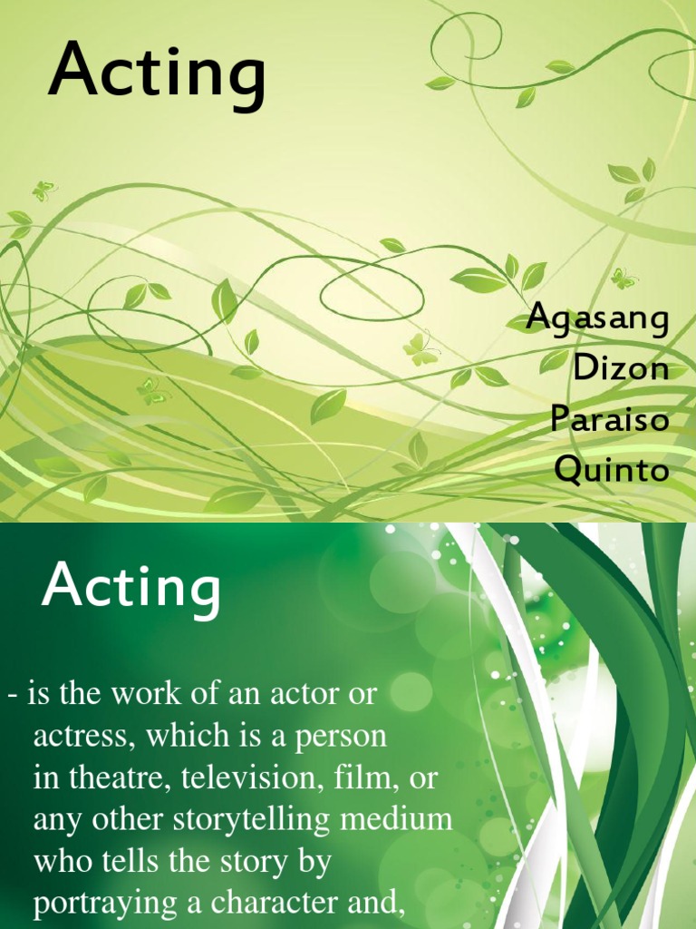 - is the work of an actor or actress, which is a person in theatre, television, film, or any other storytelling medium who tells the story by portraying a character and, usually, speaking or singing the written text or play.