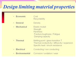 Characteristic Fatigue resistance Conductivity (heat, electric) Creep resistance Impact resistance Density (mass) Density (weight) Temperature tolerance Behavior endures many load cycles Property endurance limit thermal conductivity electrical conductivity creep strength Charpy energy mass density weight density melting point Units MPa (Mpsi) (Btu/hr) / (F-ft), Mhos MPa (ksi) N-m, (ft-lbs) kg/m3, (slugs/ft3) N/m3, (lbs/ft3) degrees C, F