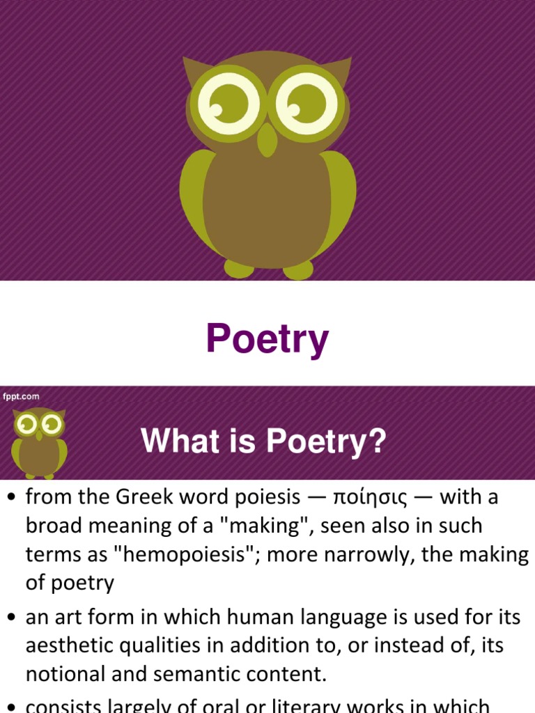 from the Greek word poiesis with a broad meaning of a "making", seen also in such terms as "hemopoiesis"; more narrowly, the making of poetry an art form in which human language is used for its aesthetic qualities in addition to, or instead of, its notional and semantic content. consists largely of oral or literary works in which language is used in a manner that is felt by its user and audience to differ from ordinary prose.