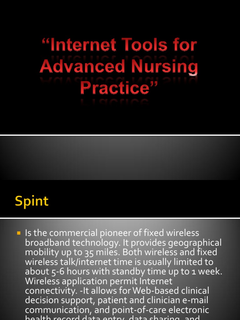 Both wireless and fixed wireless talk/internet time is usually limited to about 5-6 hours with standby time up to 1 week. Wireless application permit Internet connectivity. -It allows for Web-based clinical decision support, patient and clinician e-mail communication, and point-of-care electronic health record data entry, data sharing, and messaging, including prescription writing.