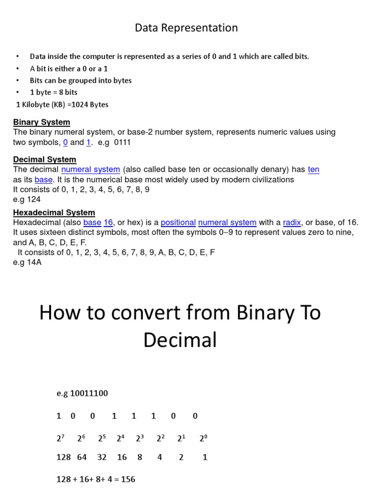 Data inside the computer is represented as a series of 0 and 1 which are called bits. A bit is either a 0 or a 1 Bits can be grouped into bytes 1 byte = 8 bits 1 Kilobyte (KB) =1024 Bytes Binary System The binary numeral system, or base-2 number system, represents numeric values using two symbols, 0 and 1. e.g 0111 Decimal System The decimal numeral system (also called base ten or occasionally denary) has ten as its base. It is the numerical base most widely used by modern civilizations It consists of 0, 1, 2, 3, 4, 5, 6, 7, 8, 9 e.g 124 Hexadecimal System Hexadecimal (also base 16, or hex) is a positional numeral system with a radix, or base, of 16. It uses sixteen distinct symbols, most often the symbols 09 to represent values zero to nine, and A, B, C, D, E, F. It consists of 0, 1, 2, 3, 4, 5, 6, 7, 8, 9, A, B, C, D, E, F e.g 14A