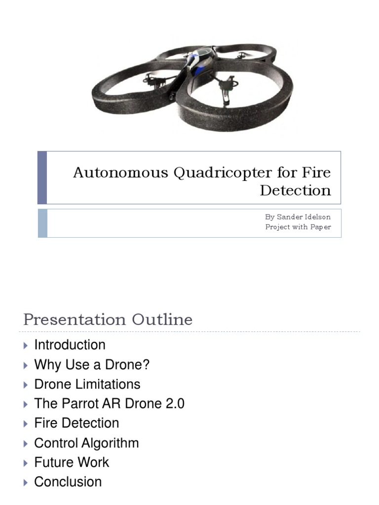 Presentation on an autonomous quadricopter for forest fire detection and tracking. Uses the Parrot AR Drone 2.0 as the quadricopter in use.