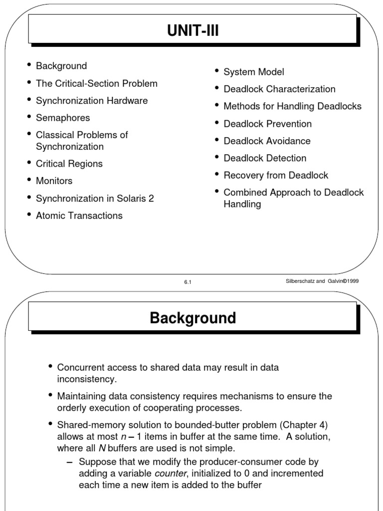 Maintaining data consistency requires mechanisms to ensure the orderly execution of cooperating processes. Shared-memory solution to bounded-butter problem (Chapter 4) allows at most n 1 items in buffer at the same time. A solution, where all N buffers are used is not simple. Suppose that we modify the producer-consumer code by adding a variable counter, initialized to 0 and incremented each time a new item is added to the buffer