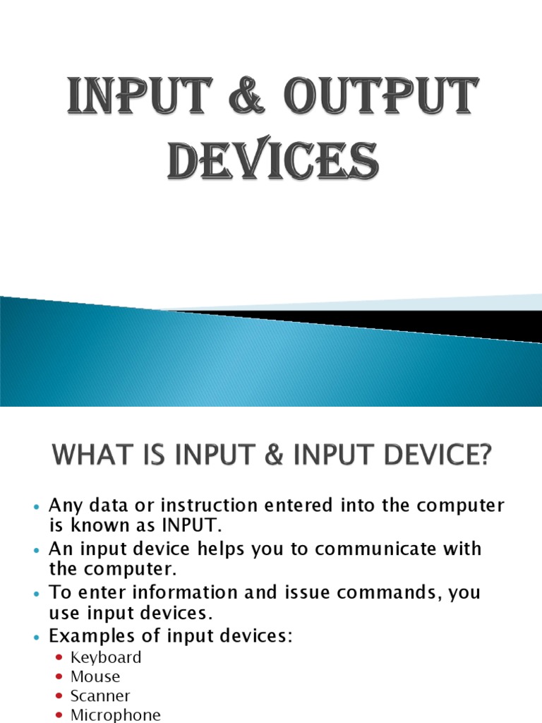 An input device helps you to communicate with the computer. To enter information and issue commands, you use input devices. Examples of input devices: