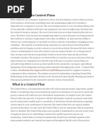 Control Plan - (n) a Process Management tool used to identify and monitor the activities required to control the critical inputs and key outputs for a process, so the process will continually meet its product or service goals.