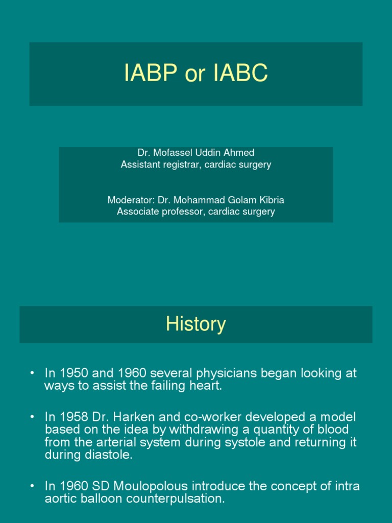 In 1950 and 1960 several physicians began looking at ways to assist the failing heart. In 1958 Dr. Harken and co-worker developed a model based on the idea by withdrawing a quantity of blood from the arterial system during systole and returning it during diastole. In 1960 SD Moulopolous introduce the concept of intra aortic balloon counterpulsation. IABP was first successfully used by Kantrowitz et al. in 1967