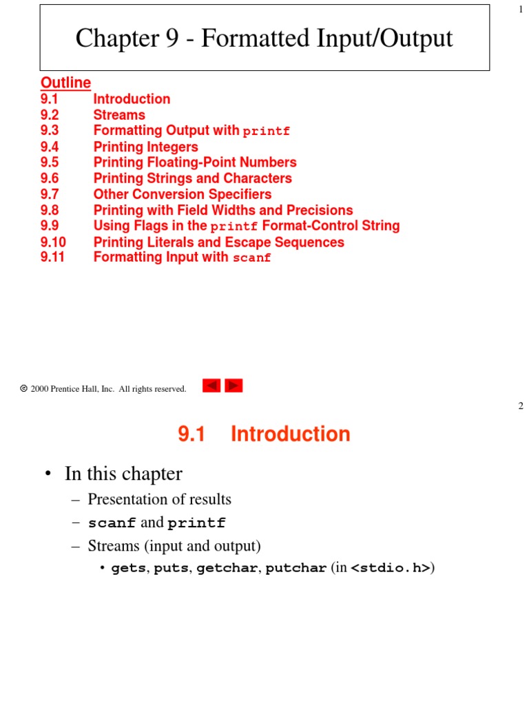 9.1 9.2 9.3 9.4 9.5 9.6 9.7 9.8 9.9 9.10 9.11 Introduction Streams Formatting Output with printf Printing Integers Printing Floating-Point Numbers Printing Strings and Characters Other Conversion Specifiers Printing with Field Widths and Precisions Using Flags in the printf Format-Control String Printing Literals and Escape Sequences Formatting Input with scanf