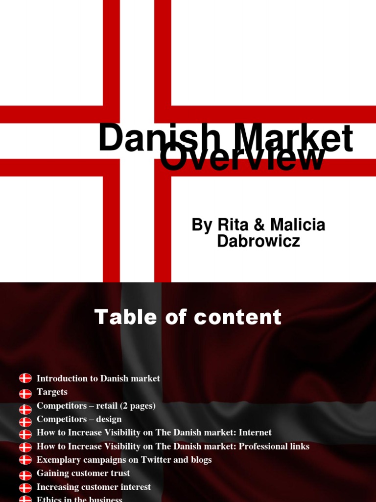 Introduction to Danish market Targets Competitors retail (2 pages) Competitors design How to Increase Visibility on The Danish market: Internet How to Increase Visibility on The Danish market: Professional links Exemplary campaigns on Twitter and blogs Gaining customer trust Increasing customer interest Ethics in the business