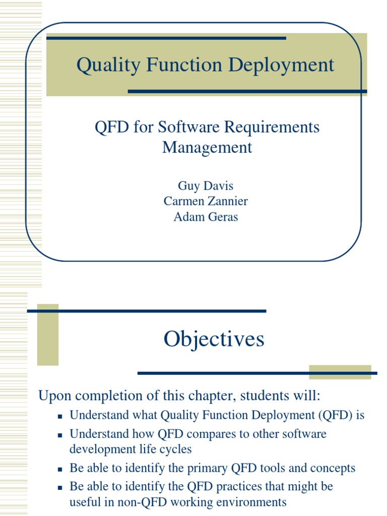 Understand what Quality Function Deployment (QFD) is Understand how QFD compares to other software development life cycles Be able to identify the primary QFD tools and concepts Be able to identify the QFD practices that might be useful in non-QFD working environments