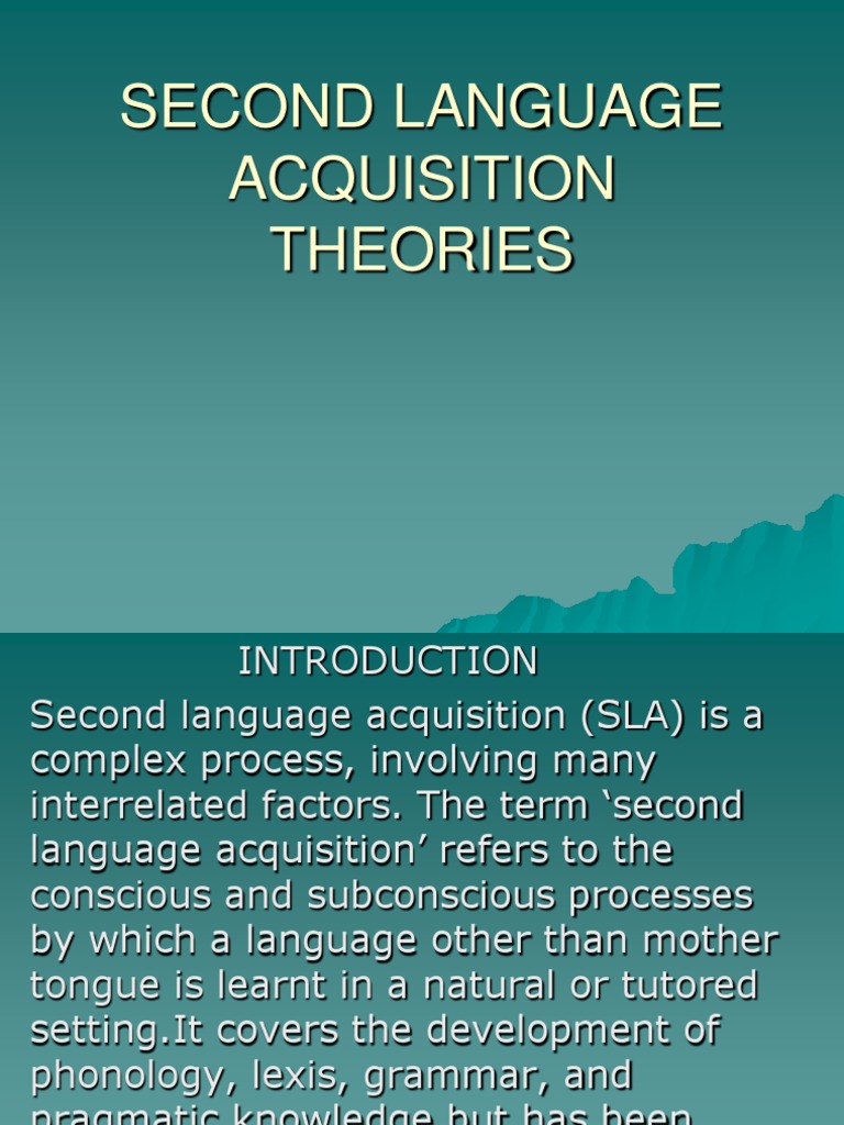 INTRODUCTION Second language acquisition (SLA) is a complex process, involving many interrelated factors. The term second language acquisition refers to the conscious and subconscious processes by which a language other than mother tongue is learnt in a natural or tutored [Link] covers the development of phonology, lexis, grammar, and pragmatic knowledge but has been largely confined to morphosyntax.
