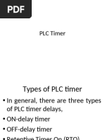 An on-delay timer will wait for a set time after a line of ladder logic has been true before turning on, but it will turn off immediately. An off-delay timer will turn on immediately when a line of ladder logic is true, but it will delay before turning off. Consider the example of an old car. If you turn the key in the ignition and the car does not start immediately, that is an on-delay. If you turn the key to stop the engine but the engine doesn't stop for a few seconds, that is an off delay. An on-delay timer can be used to allow an oven to reach temperature before starting production. An off delay timer can keep cooling fans on for a set time 1 after the oven has been turned off.