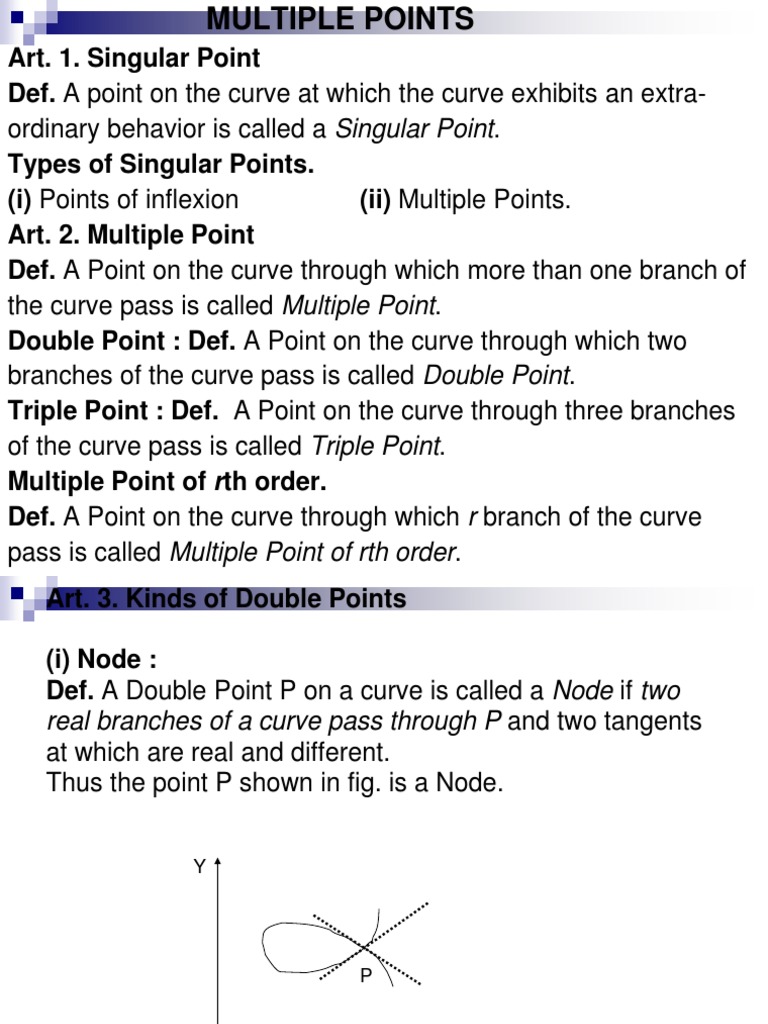 Art. 1. Singular Point Def. A point on the curve at which the curve exhibits an extraordinary behavior is called a Singular Point. Types of Singular Points. (i) Points of inflexion (ii) Multiple Points. Art. 2. Multiple Point Def. A Point on the curve through which more than one branch of the curve pass is called Multiple Point. Double Point : Def. A Point on the curve through which two branches of the curve pass is called Double Point. Triple Point : Def. A Point on the curve through three branches of the curve pass is called Triple Point. Multiple Point of rth order. Def. A Point on the curve through which r branch of the curve pass is called Multiple Point of rth order.