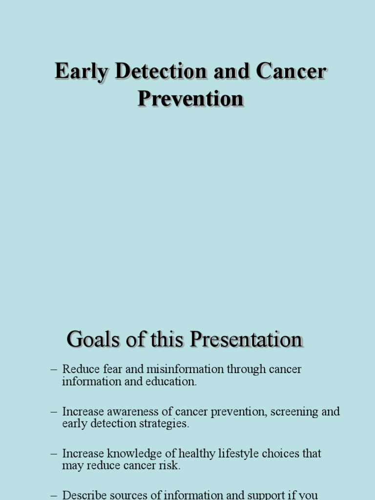Increase awareness of cancer prevention, screening and early detection strategies. Increase knowledge of healthy lifestyle choices that may reduce cancer risk.