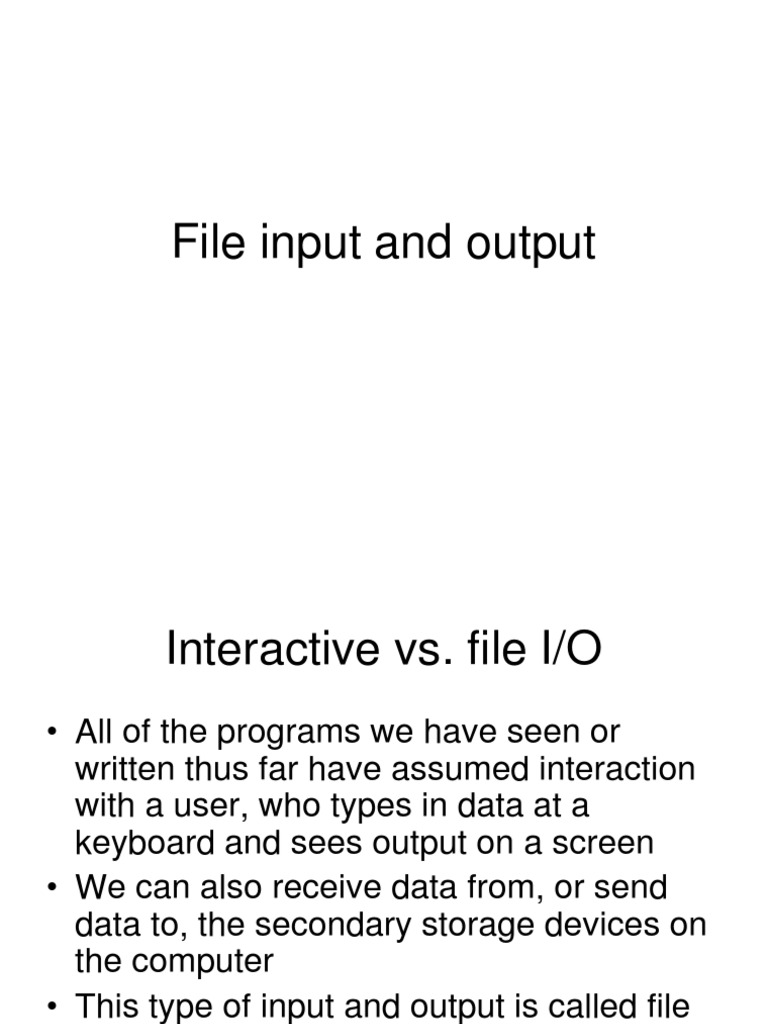 All of the programs we have seen or written thus far have assumed interaction with a user, who types in data at a keyboard and sees output on a screen We can also receive data from, or send data to, the secondary storage devices on the computer This type of input and output is called file I/O