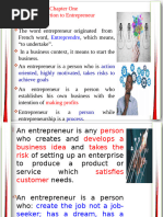 The word entrepreneur originates from the French word, entreprendre, which means "to undertake. In a business context, it means to start a business. The Merriam-Webster Dictionary presents the definition of an entrepreneur as one who organizes, manages, and assumes the risks of a business or enterprise. The concept of entrepreneurship has a wide range of meanings. On the one extreme an entrepreneur is a person of very high aptitude who pioneers change, possessing characteristics found in only a very small fraction of the population. On the other extreme of definitions, anyone who wants to work for himself or herself is considered to be an entrepreneur.