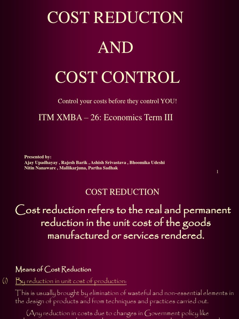 Means of Cost Reduction (i) By reduction in unit cost of production: This is usually brought by elimination of wasteful and non-essential elements in the design of products and from techniques and practices carried out. (Any reduction in costs due to changes in Government policy like reduction in taxes or duties or due to price agreements do not come into the area of cost reduction as these are not real and permanent reductions in costs).