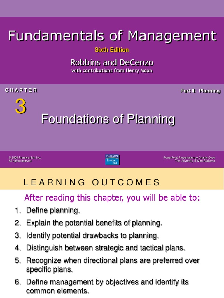 1. Define planning. 2. Explain the potential benefits of planning. 3. Identify potential drawbacks to planning. 4. Distinguish between strategic and tactical plans.