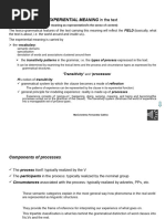 Senser: an entity endowed with higher or lower consciousness, like a human being and, for some processes, an animal. It can be Subject (I like fruit) or Complement (Fruit appeals to/pleases me); Phenomenon: a thing (person, object, place, etc.) that can be perceived, known or that can be the object of an emotion of some kind. It is a participant in the mental clause and it is always a Ngp (He saw the animal; he knew the animal; He loves animals); Macro-phenomenon: Act: an event or happening or doing in the material world that can be perceived; only used with processes of perception. It is an embedded clause that is a participant in the mental clause (he saw [[him help the old lady/him helping the old lady]]; he heard [[him shout his name/him shouting his name]]).