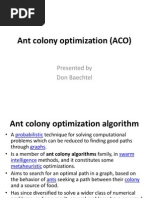 The ant colony optimization algorithm (ACO) is a probabilistic technique for solving computational problems which can be reduced to finding good paths through graphs.