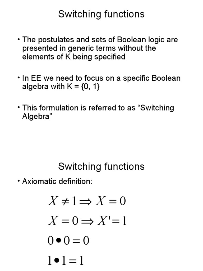 The postulates and sets of Boolean logic are presented in generic terms without the elements of K being specified In EE we need to focus on a specific Boolean algebra with K = {0, ! This formulation is referred to as "Switching #lgebra$