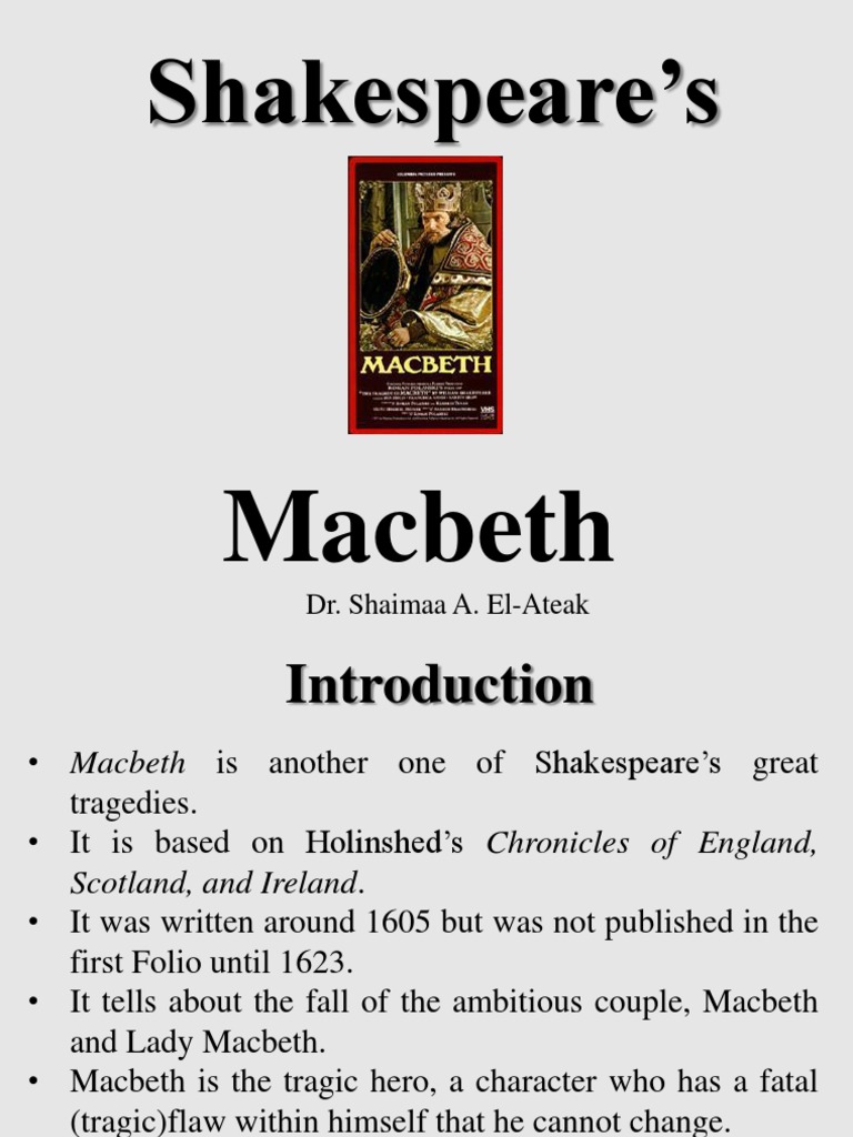 Macbeth is another one of Shakespeares great tragedies. It is based on Holinsheds Chronicles of England, Scotland, and Ireland. It was written around 1605 but was not published in the first Folio until 1623. It tells about the fall of the ambitious couple, Macbeth and Lady Macbeth. Macbeth is the tragic hero, a character who has a fatal (tragic)flaw within himself that he cannot change. He is not a bad person; he is just too ambitious.