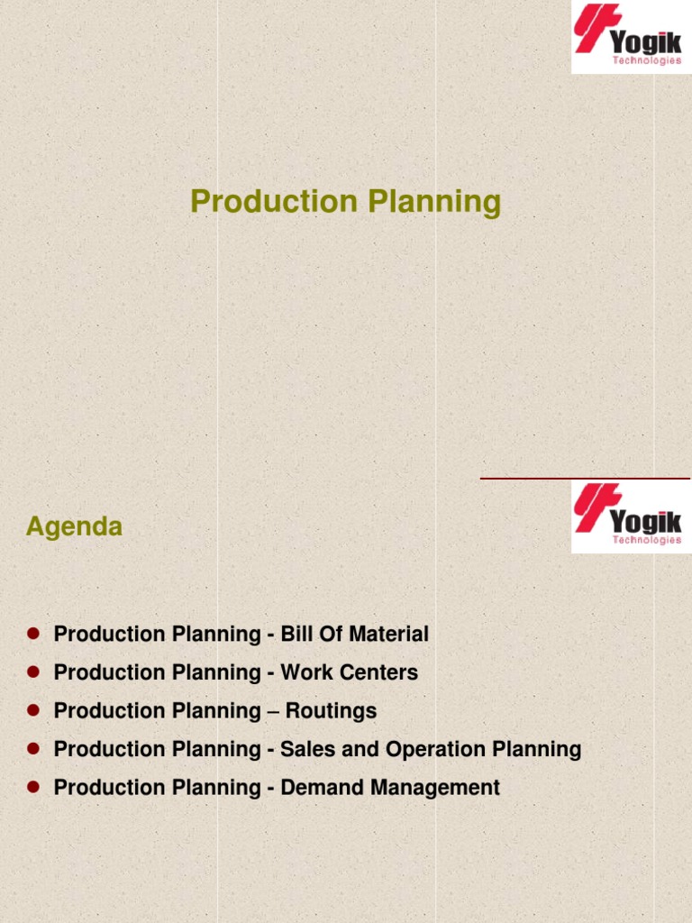 Production Planning - Bill Of Material Production Planning - Work Centers Production Planning Routings Production Planning - Sales and Operation Planning Production Planning - Demand Management
