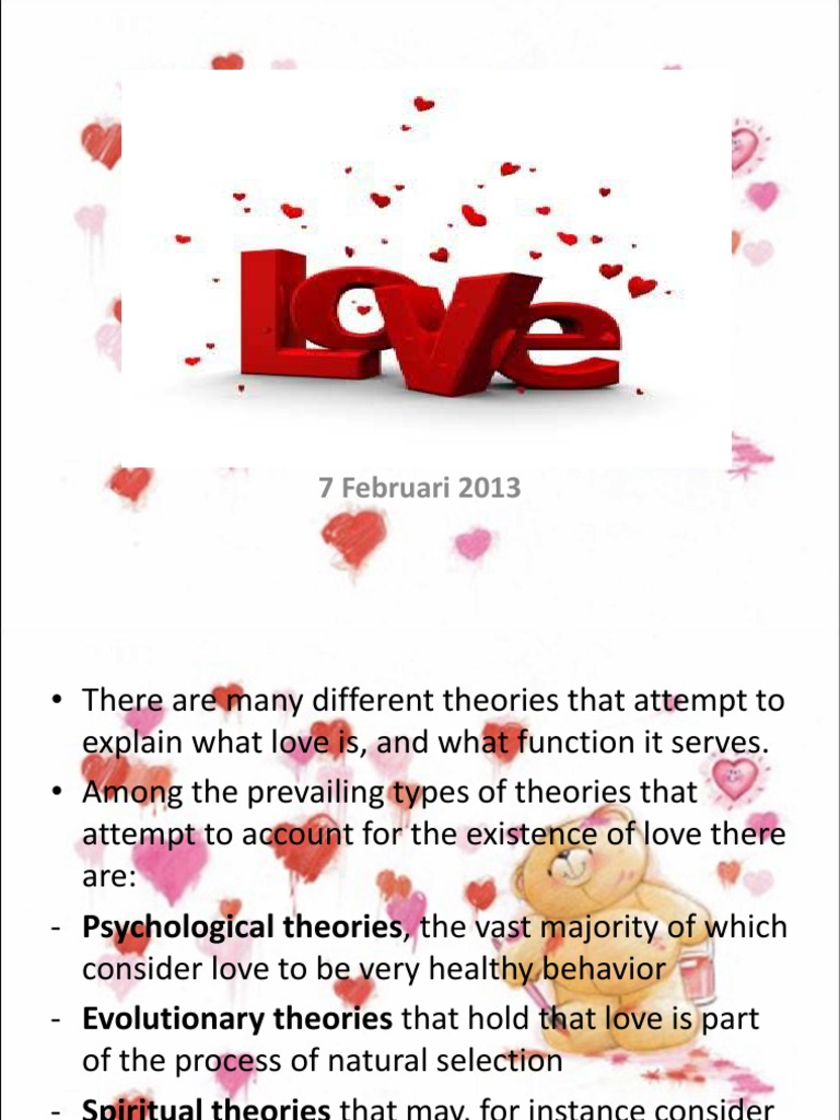 There are many different theories that attempt to explain what love is, and what function it serves. Among the prevailing types of theories that attempt to account for the existence of love there are: - Psychological theories, the vast majority of which consider love to be very healthy behavior - Evolutionary theories that hold that love is part of the process of natural selection - Spiritual theories that may, for instance consider love to be a gift from God.