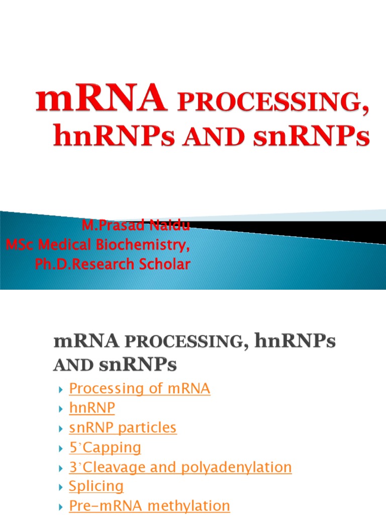 Processing of mRNA hnRNP snRNP particles 5Capping 3Cleavage and polyadenylation Splicing Pre-mRNA methylation