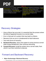 Backward error recovery schemes require that a distributed system regularly records a consistent global state to stable storage. This is known as a distributed snapshot In a distributed snapshot, if a process P has recorded the receipt of a message, then there is also a process Q that has recorded the sending of that message To recover after a process or system failure, it is best to recover to the most recent distributed snapshot, also known as the recovery line Independent checkpointing: Coordinated checkpointing: Message logging: