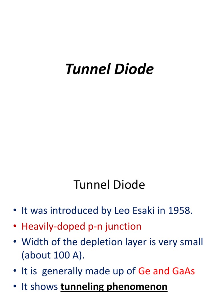 It was introduced by Leo Esaki in 1958. Heavily-doped p-n junction Width of the depletion layer is very small (about 100 A). It is generally made up of Ge and GaAs It shows tunneling phenomenon