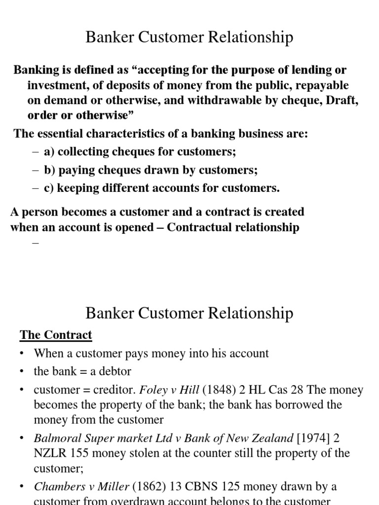 The Contract When a customer pays money into his account the bank = a debtor customer = creditor. Foley v Hill (1848) 2 HL Cas 28 The money becomes the property of the bank; the bank has borrowed the money from the customer Balmoral Super market Ltd v Bank of New Zealand [1974] 2 NZLR 155 money stolen at the counter still the property of the customer; Chambers v Miller (1862) 13 CBNS 125 money drawn by a customer from overdrawn account belongs to the customer