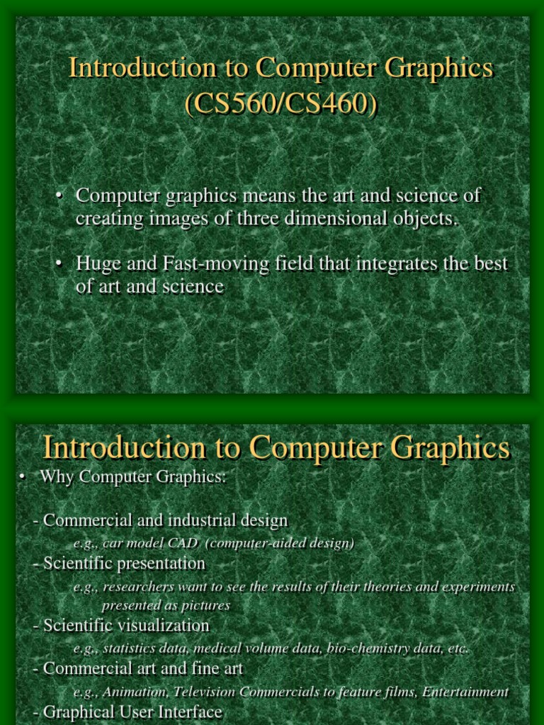Computer graphics means the art and science of creating images of three dimensional objects. Huge and Fast-moving field that integrates the best of art and science