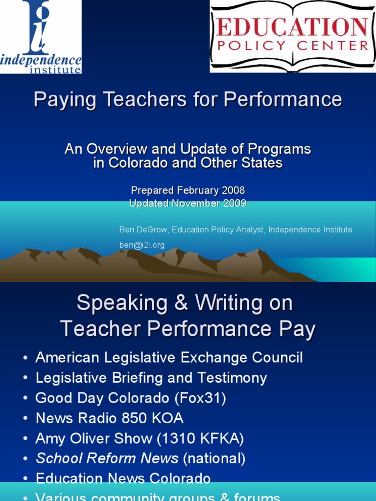 ben@i2i.org Speaking & Writing on Teacher Performance Pay • American Legislative Exchange Council • Legislative Briefing and Testimony • Good Day Colorado (Fox31) • News Radio 850 KOA • Amy Oliver Show (1310 KFKA) • School Reform News (national) • Education News Colorado • Various community groups & forums Overview