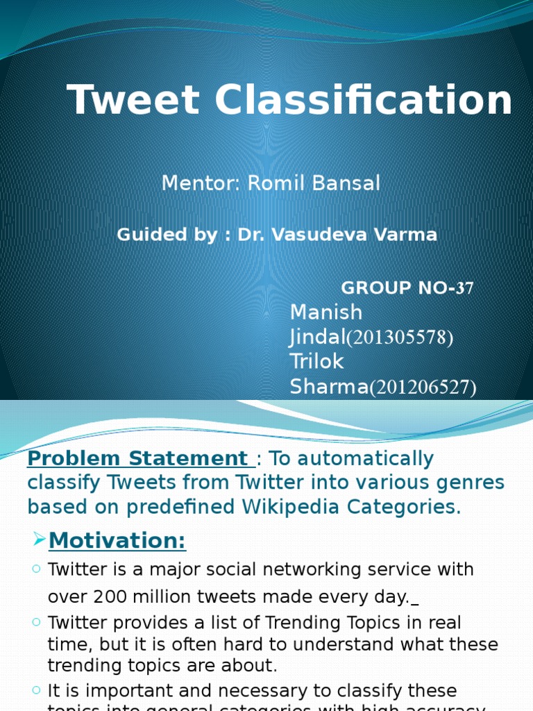 Final Deliverable: o It will return list of all categories to which the input tweet belongs. . o It will also give the accuracy of the algorithm used for classifying tweets. o Training dataset : Fetched from twitter with twitter4j api.Data Dataset : o Input Data is the static / real-time data consisting of the user tweets.