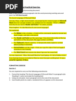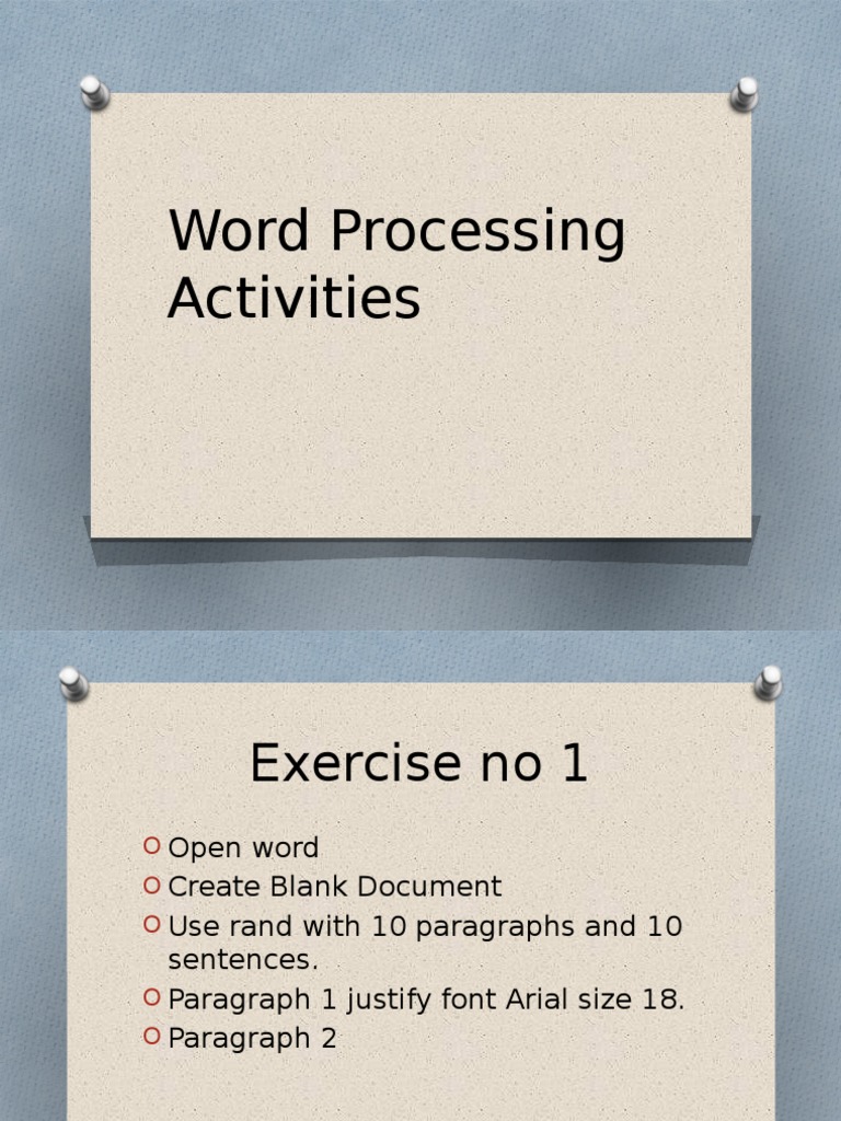 The document provides instructions for a word processing exercise to create a blank document with 10 paragraphs containing 10 sentences each, with the first paragraph using Arial font size 18 and justified text alignment.