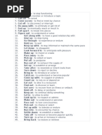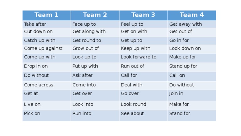 The document lists various phrasal verbs organized under team headings without further context. Team 1 has one entry, Team 2 has one entry, Team 3 has one entry, and Team 4 has one entry. The remaining entries are not organized under any team heading.