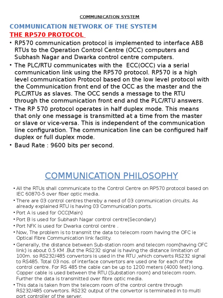 All the RTUs shall communicate to the Control Centre on RP570 protocol based on