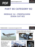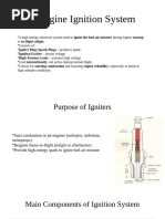 The document describes the starting and ignition system of a jet engine. It involves using a starter motor powered by an external gearbox to drive the engine shaft and get it spinning. Once the turbine is spinning fast enough, air is forced through the engine to provide thrust. Igniter boxes use high voltage electricity to create sparks that ignite the fuel-air mixture and fully start the combustion process in the engine. The system allows the jet engine to start and continue running until it can be self-sustaining.