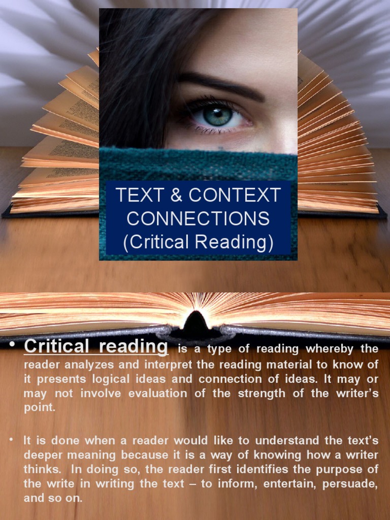 . When a writer presents his or her opinions or arguments. CRITICAL READING can now be define as…. claim of policy or a claim of value. he or she may do so by presenting a claim of fact. . Looking for ways of thinking because it involves trying to determine the way the writer of a particular text thinks.