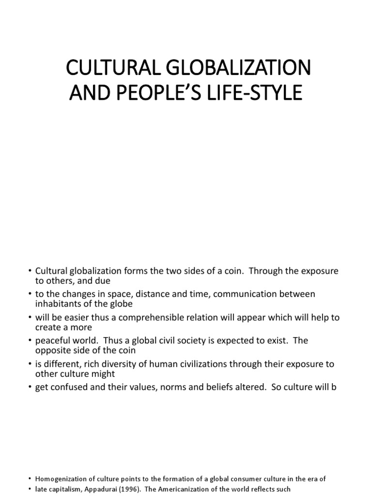 to inhabitants around the world. Such homogenization could create a uniform world culture